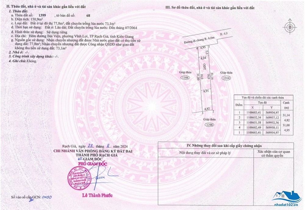 Diện tích: 6m x 50m = 303m2. Có 60m2 đất ở đô thị, còn lại đất trồng lúa.
