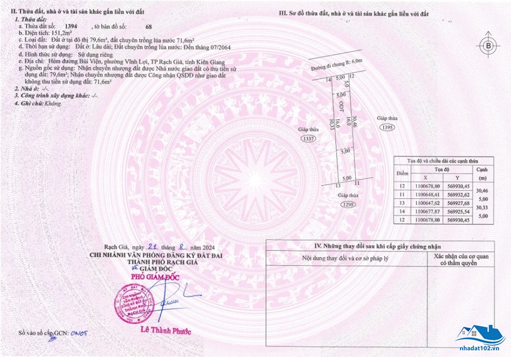 Diện tích: 5m x 30,5m = 150m2. Có 100m2 đất ở, còn lại đất lúa