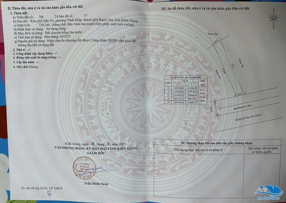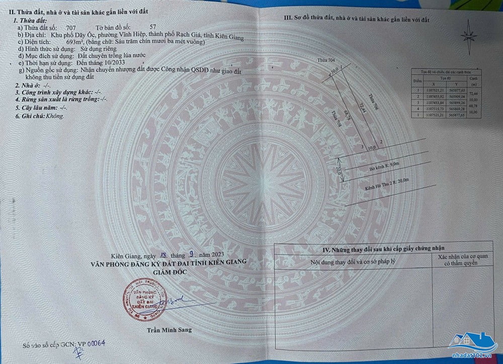 Nền 1. Có 2 nền liền. Thửa 4623 + 4624. Diện tích: 5m x 21m = 105m2. Hướng tây bắc. Giá bán: 1 tỷ/nền