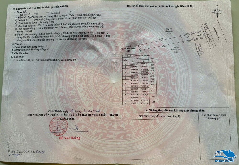 Diện tích: 5m x 61m = 306,9m2. Có 50m2 đất ở, còn lại đất lúa