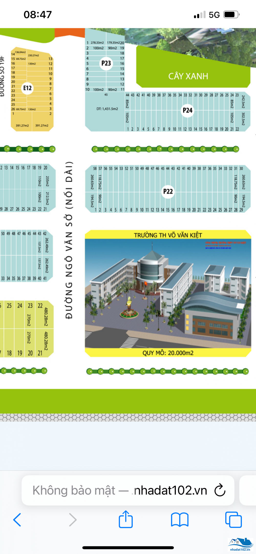 Nền E2: Diện tích: 5m x 20m = 100m2. Hướng đông nam. Giá bán: 630 triệu