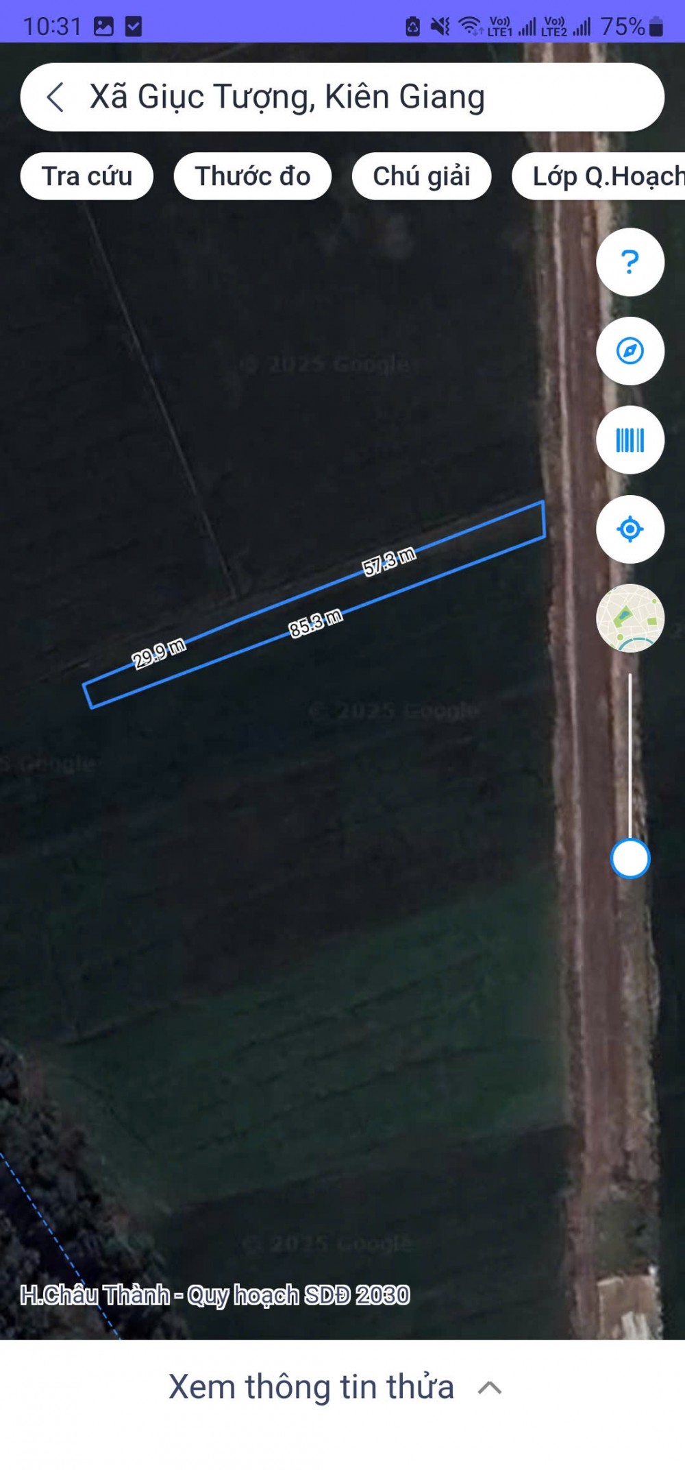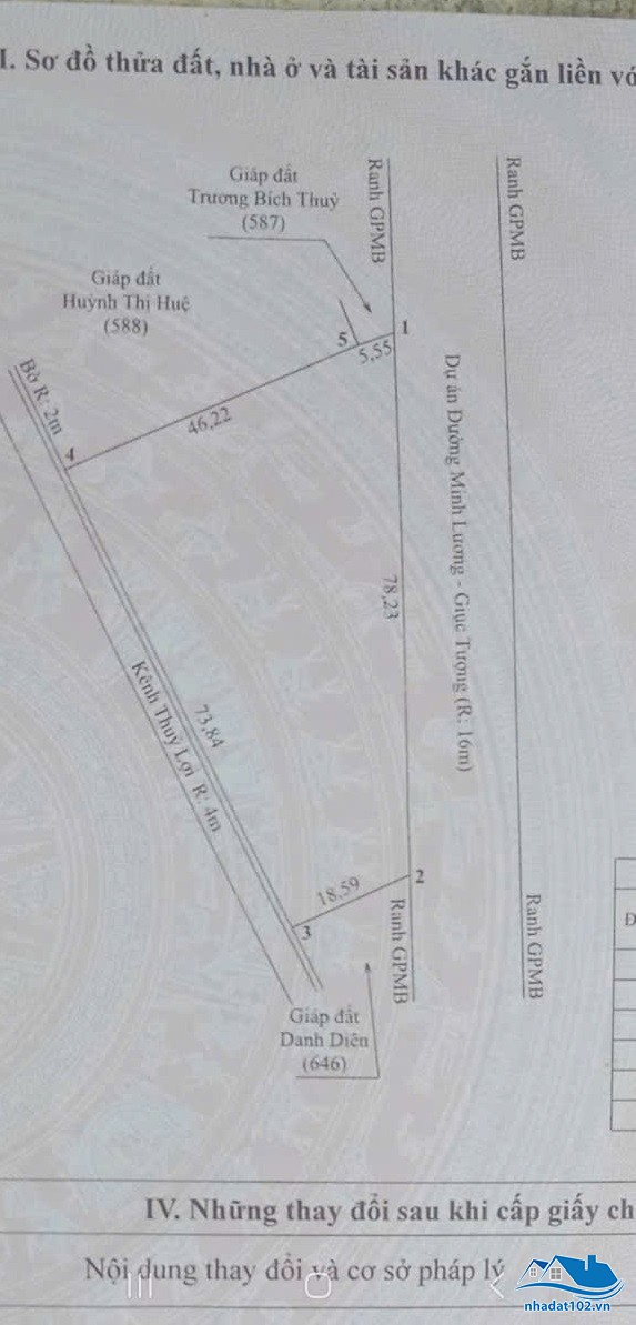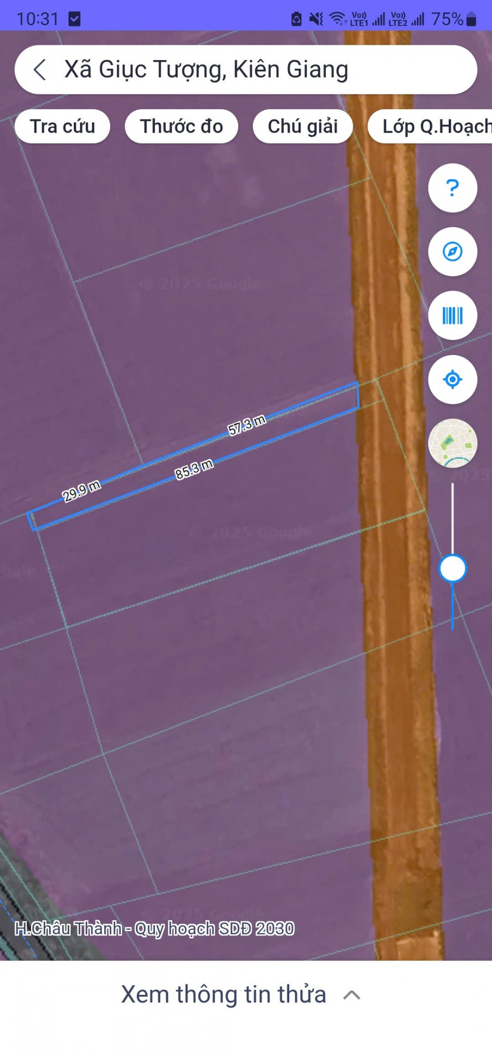 Diện tích: 78m (hậu 73,8m) x 46m (1 cạnh 18,5m) = 2.587m2. Đất lúa, quy hoạch full thổ