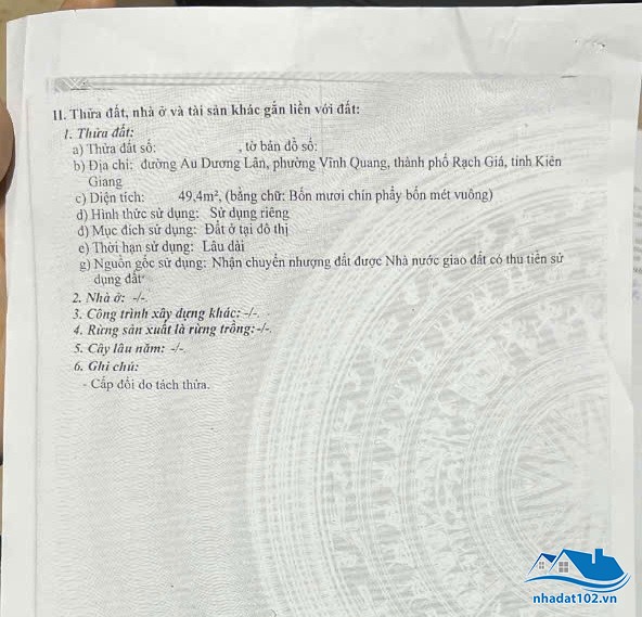 Diện tích đất: 5m x 20m = 100m2; đất ở tại đô thị 100%.