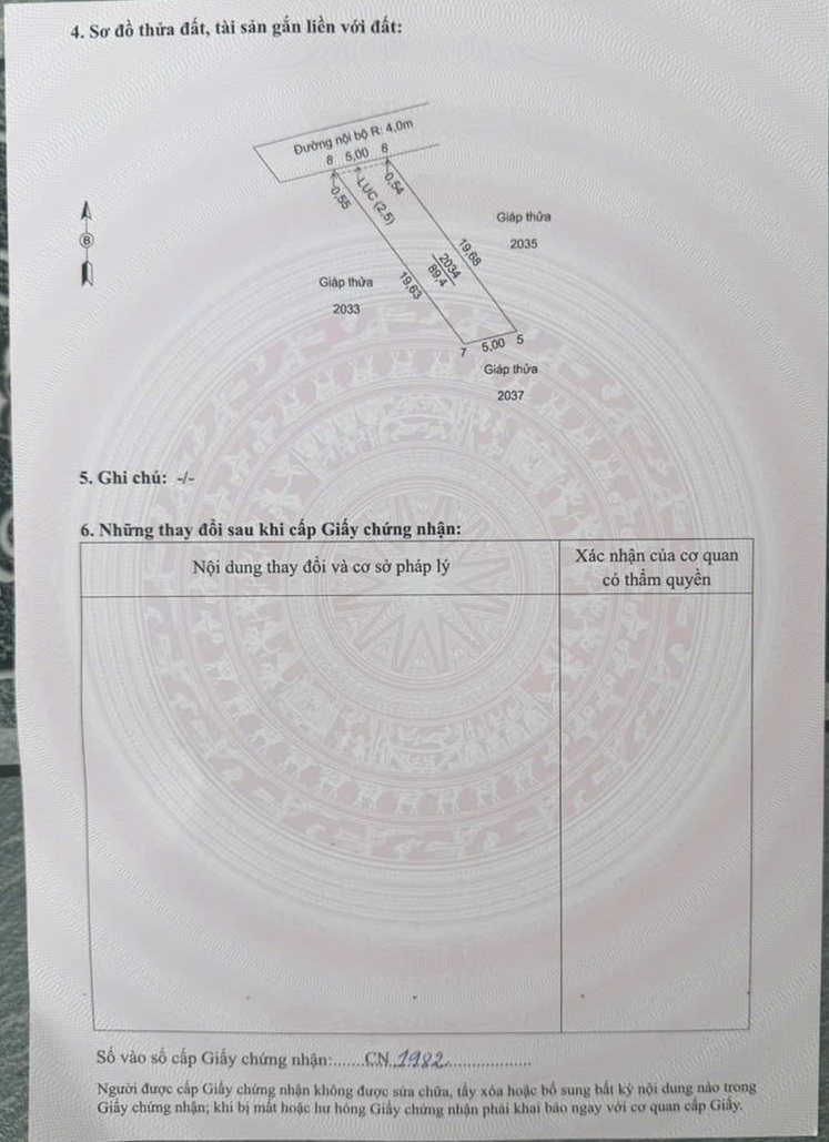 Diện tích: 5m x 20m = 99,7m2. Có 36m2 đất ở, còn lại đất lúa.