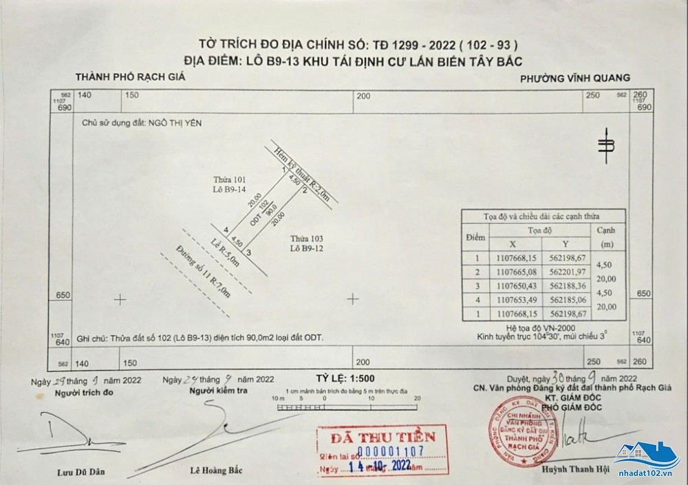 Nền 1. Thửa 4508. Diện tích: 5m x 22,5m = 112,5m2. Đất thổ cư 100%. Hướng đông nam. Giá bán: 900 triệu