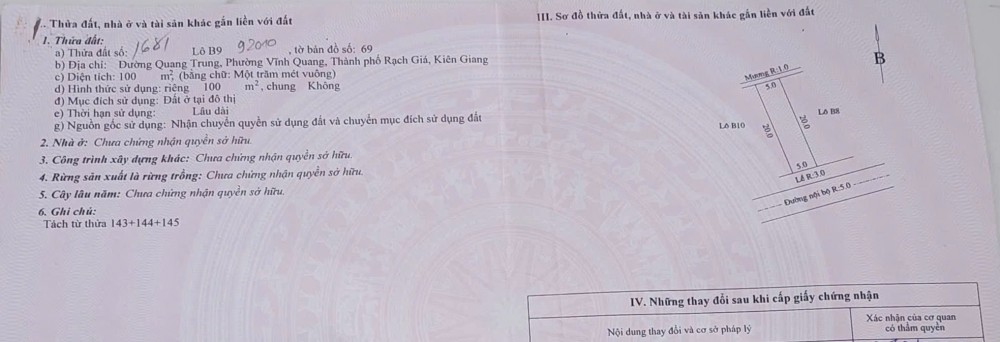Diện tích: 5m x 20m = 100m2. Thổ cư 100%.