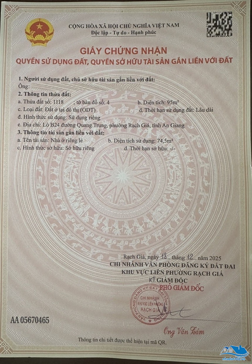 Bán nhà giấy tay hẻm Quang Trung (phường Vĩnh Quang cũ - phường Rachh Giá, An Giang)