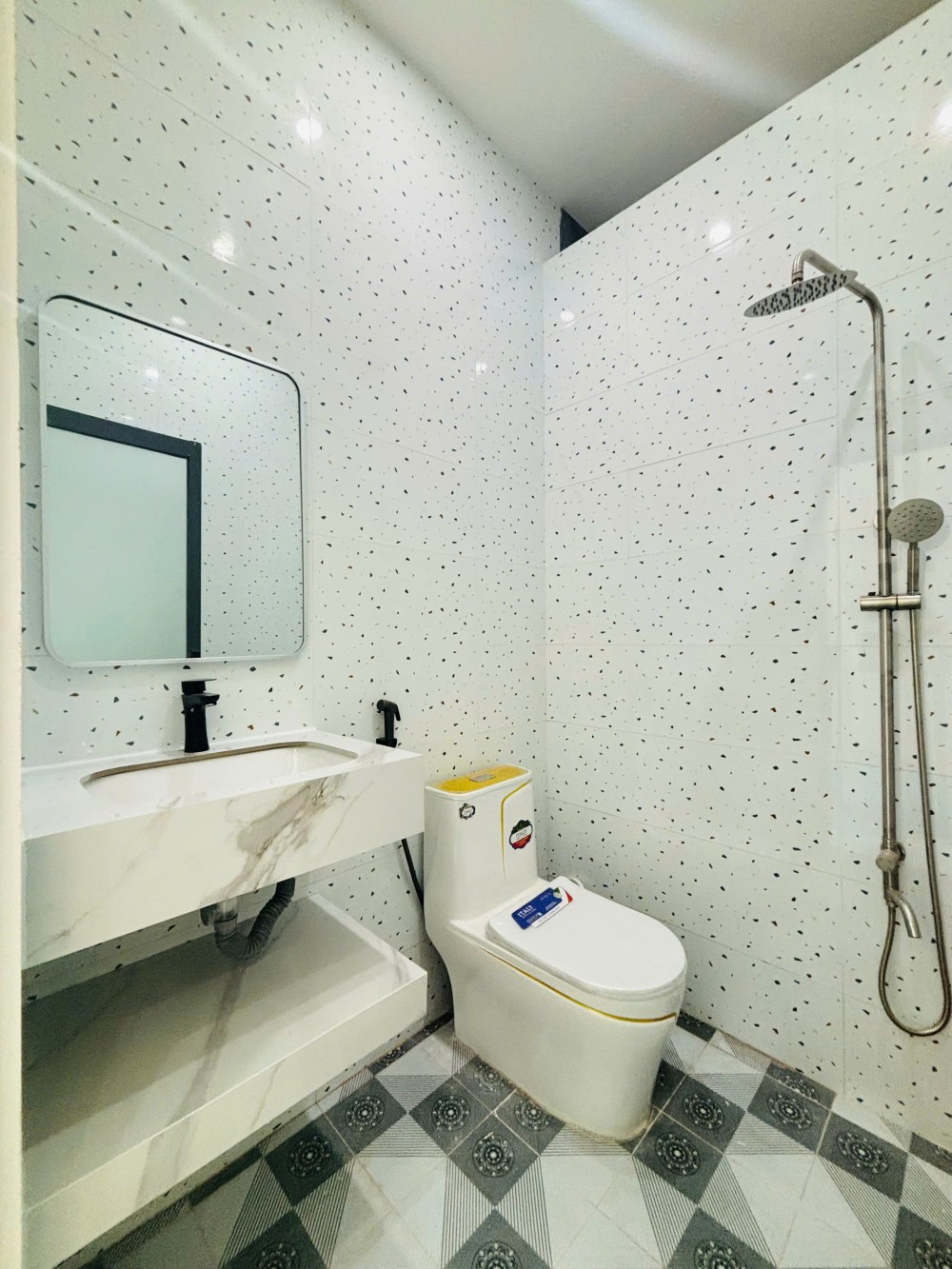 Các phòng ngủ, toilet đều được ốp gạch tới trần nhà.