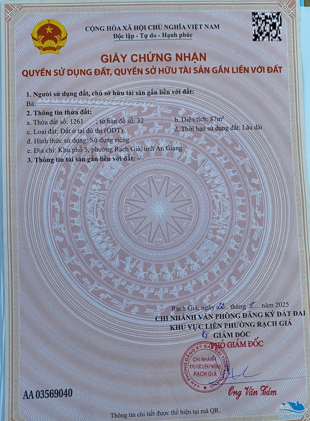 Diện tích đất: 5m x 20m = 100m2; đất ở đô thị 100%.