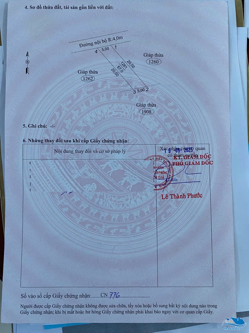 Nền 1. Thửa 4508. Diện tích: 5m x 22,5m = 112,5m2. Đất thổ cư 100%. Hướng đông nam. Giá bán: 900 triệu