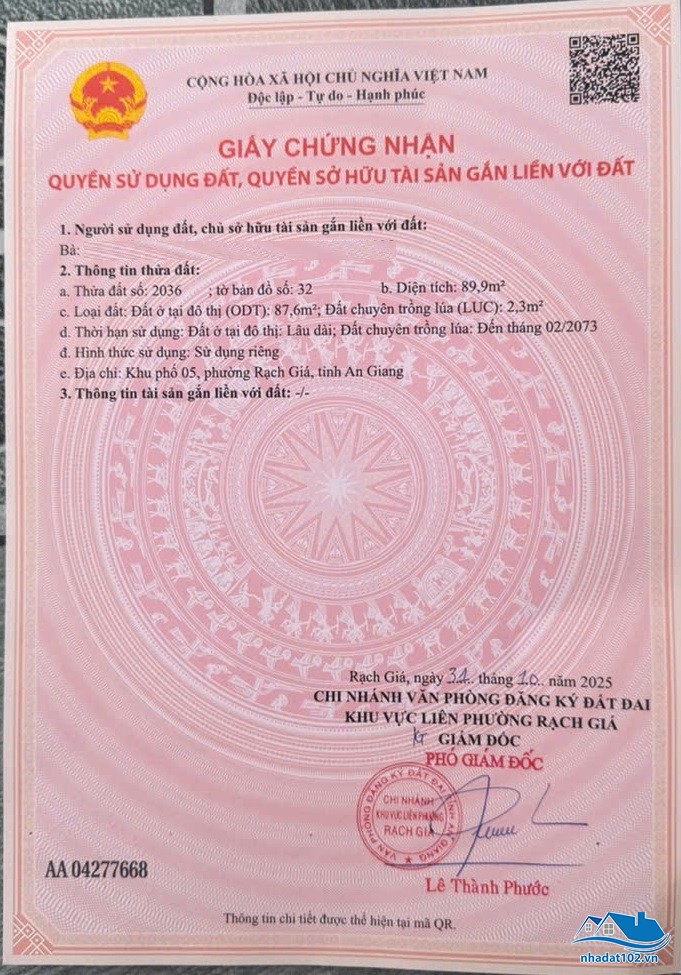 Diện tích đất: 5m x 20m = 100m2; đất ở đô thị 100%.