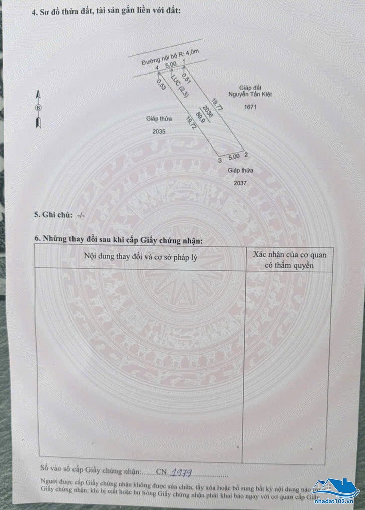 Nền 1. Thửa 4508. Diện tích: 5m x 22,5m = 112,5m2. Đất thổ cư 100%. Hướng đông nam. Giá bán: 900 triệu