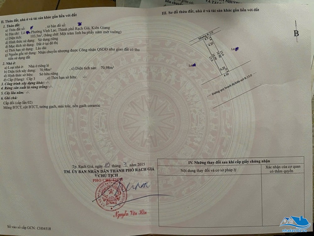 Bán nhà đường Lê Vĩnh Hoà (phường Vĩnh Lạc cũ - phường Rạch Giá, An Giang)