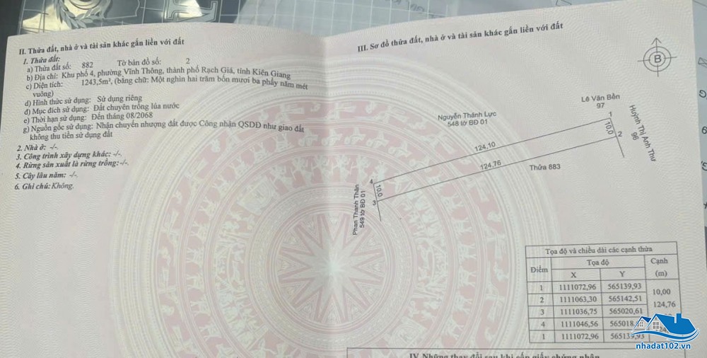 Nền 1. Có 2 nền liền. Thửa 4623 + 4624. Diện tích: 5m x 21m = 105m2. Hướng tây bắc. Giá bán: 1 tỷ/nền