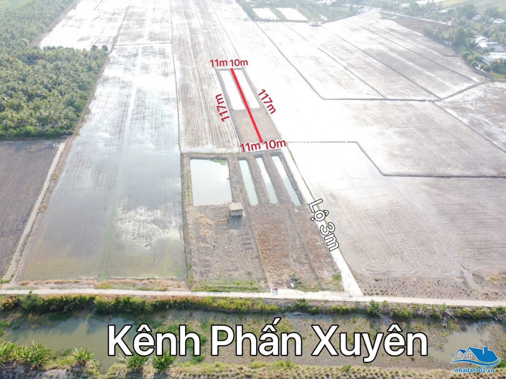 Diện tích: 5m x 42m = 210m2. Có 100m2 đất ở, còn lại đất lúa. Có 2 nền liền