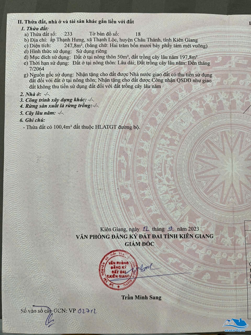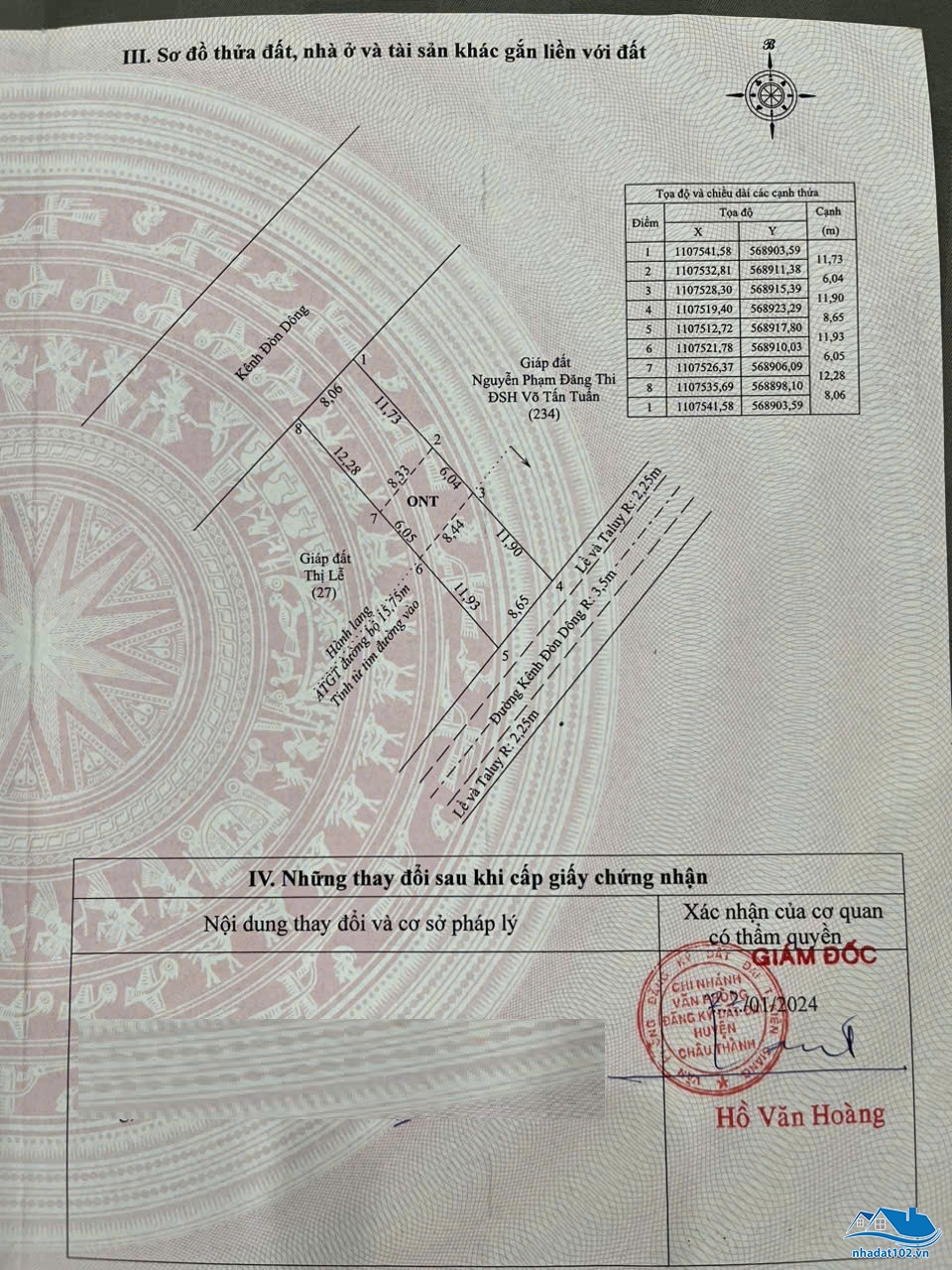 Diện tích: 1.042,1m2 + 1.651,9m2 = 2.694m2. Có 600m2 đất ở, còn lại đất vườn.