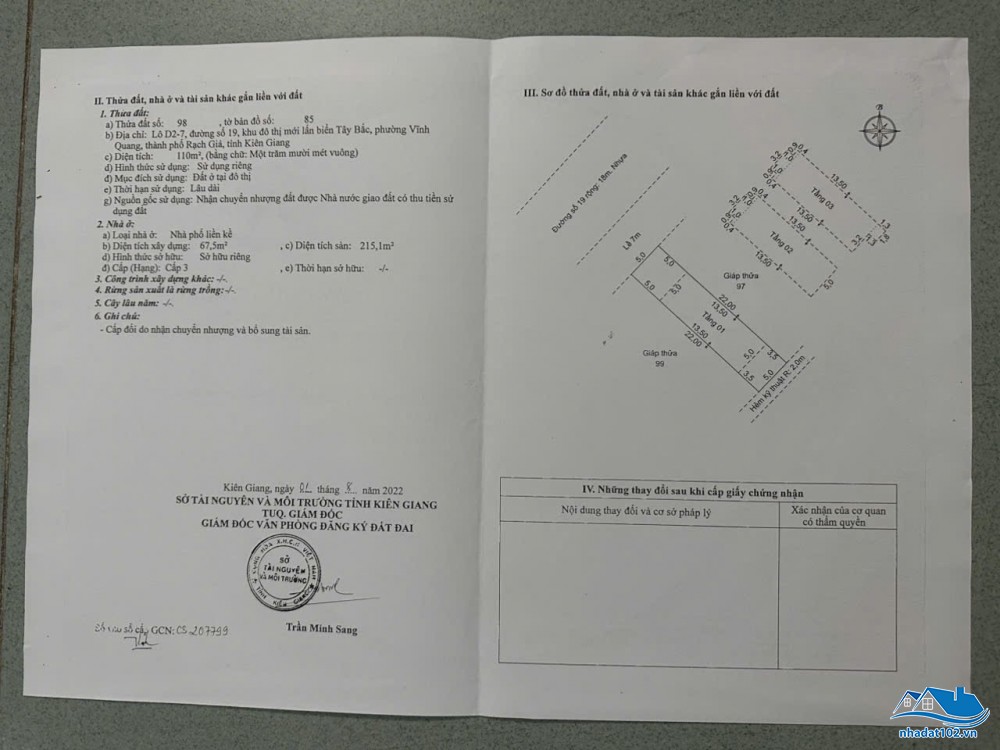 Diện tích đất: 5m x 22m = 110m2; đất ở đô thị 100%.